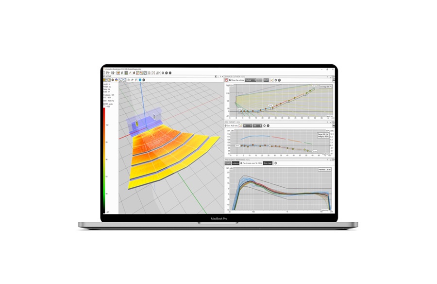 Entwerfen Sie eine Linienquelle mit variabler Krümmung in der Soundvision-Software mit fortschrittlichen Einstellwerkzeugen für Winkel zwischen den Elementen und FIR-Filtern